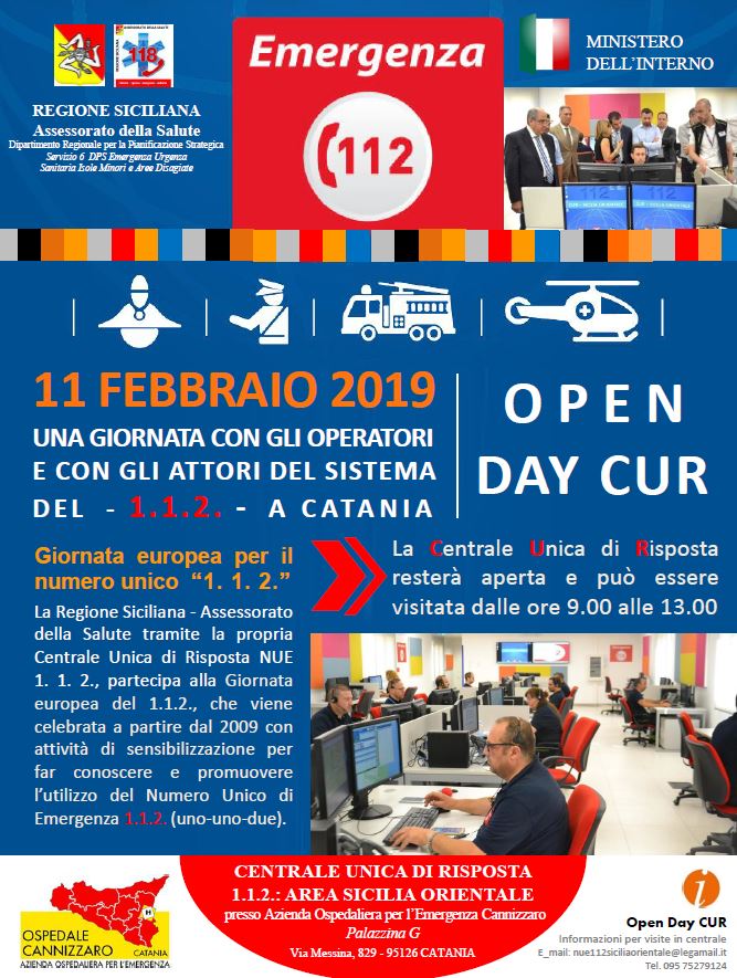 La Centrale Unica di Risposta per la Sicilia Orientale aprirà le porte al pubblico lunedì 11 febbraio, Giornata europea per il numero unico d’emergenza 1-1-2. Dalle 9 alle 13, infatti, sarà possibile visitare i locali della CUR, ospitata nella palazzina G dell’Azienda Ospedaliera per l’Emergenza “Cannizzaro” di Catania, nell’ambito delle iniziative volute da EENA (European Emergency Number Association) e Ministero dell’Interno per dare ai cittadini l’opportunità di scoprire il lavoro svolto all’interno delle Centrali Uniche di Risposta.