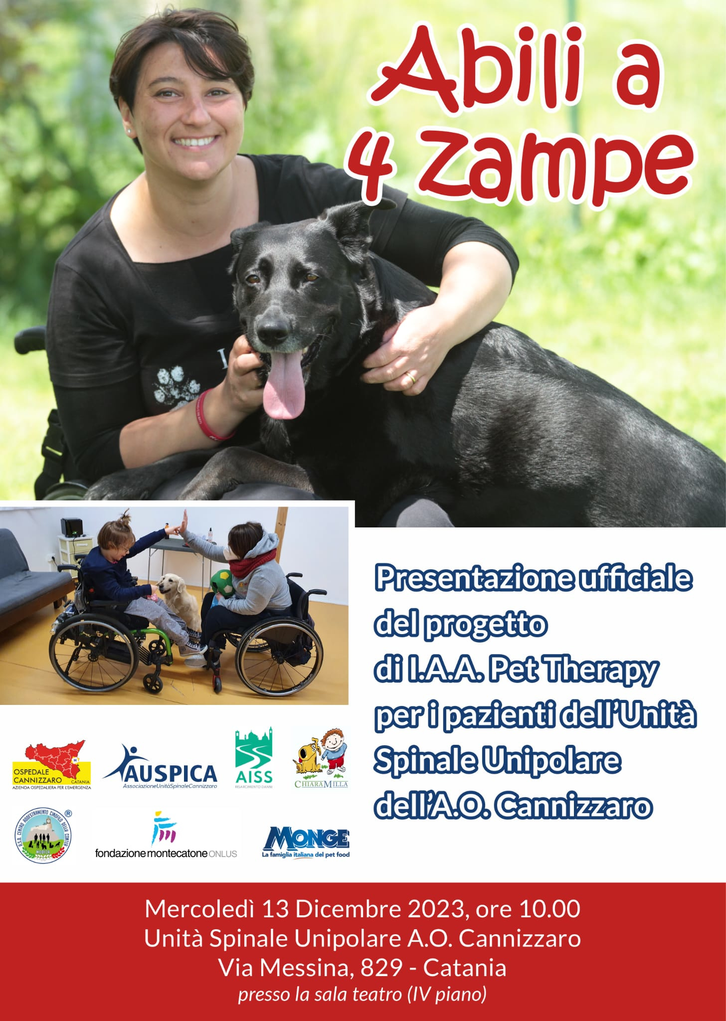 La Pet Therapy “sbarca” all’Unità Spinale Unipolare (USU) dell’Ospedale Cannizzaro di Catania con il progetto “Abili a 4 zampe” che sarà presento mercoledì 13 dicembre, alle ore 10, nel salone al quarto piano della struttura (edificio S).