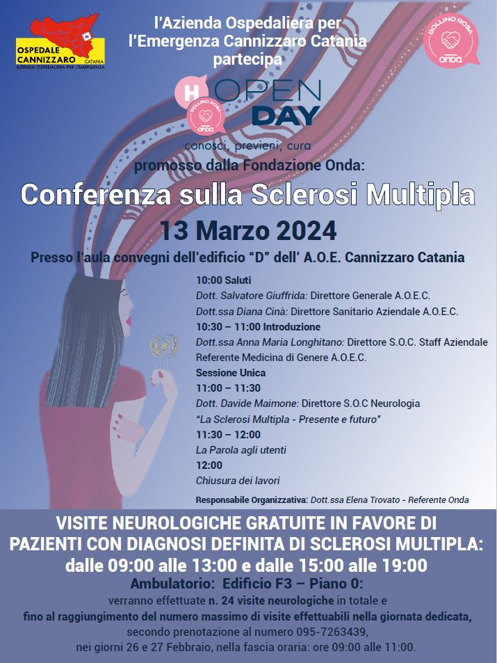 Nella stessa data, dalle ore 10 alle 12, l’aula convegni dell’edificio D dell’Ospedale Cannizzaro ospiterà una conferenza informativa sulla Sclerosi Multipla: sono previsti gli interventi del dott. Salvatore Giuffrida, direttore generale, della dott.ssa Diana Cinà, direttore sanitario, della dott.ssa Anna Maria Longhitano, direttore dell'UOC di Staff e referente aziendale Medicina di Genere; relazionerà il dott. Davide Maimone, direttore della Neurologia, sul tema "La Sclerosi Multipla: presente e futuro", seguirà un confronto con gli utenti.